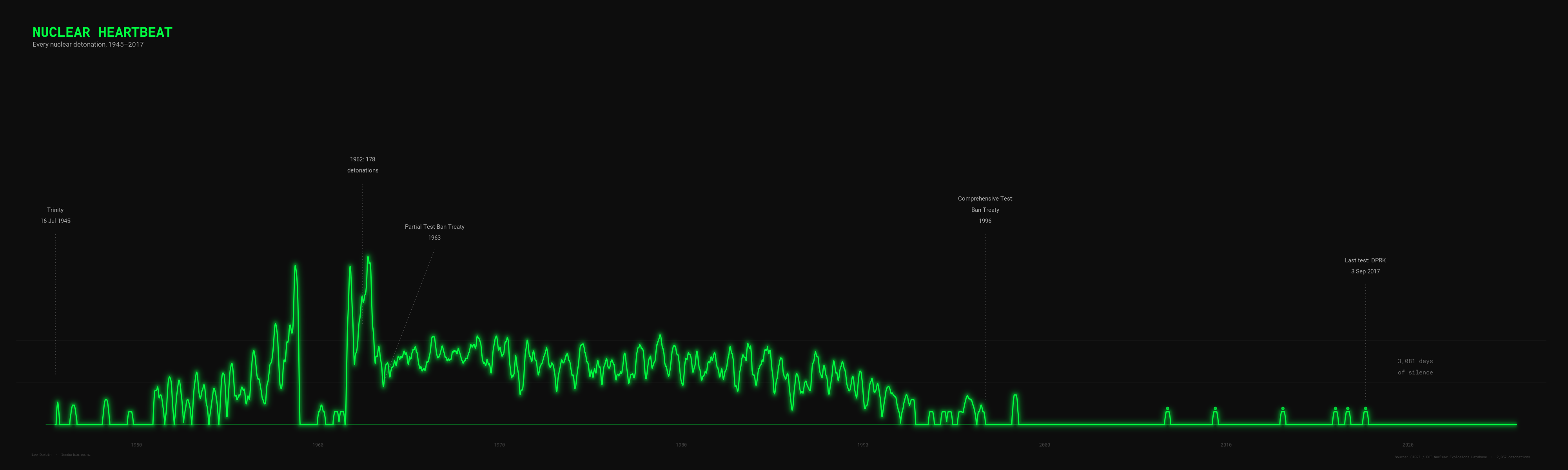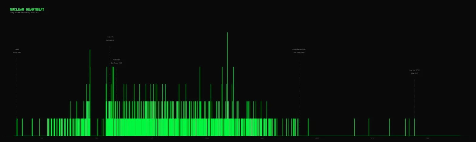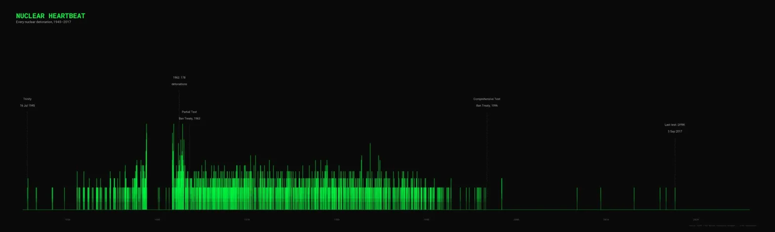 Project: Nuclear Heartbeat — ECG-style visualization of every nuclear explosion from 1945 to 2017