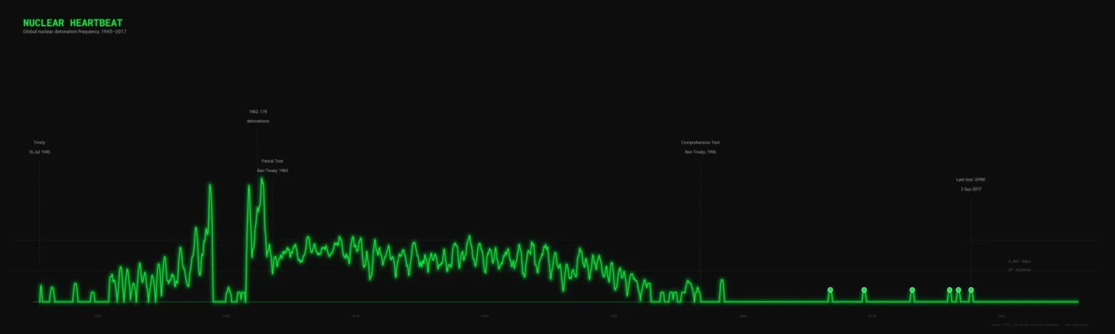 Plot every single detonation as a pulse on a timeline, like a seismograph or ECG trace. During the late 1950s and early 1960s the "heartbeat" would be frantic and almost continuous, then it calms after the Partial Test Ban Treaty in 1963, has periodic surges, and eventually flatlines after 1996 with only the faint occasional North Korean blip. This works beautifully as a horizontal scrolling animation or a long-form infographic. The visual metaphor of a heartbeat slowing and stopping is immediately intuitive.