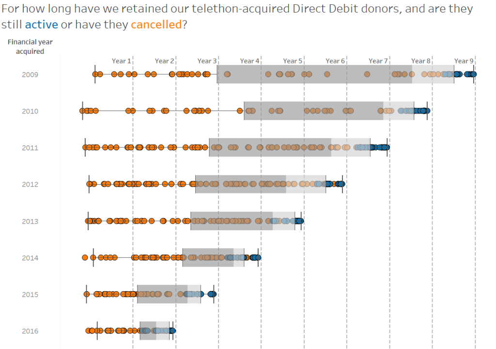 - Look at the start of the shaded area in each year, where everything up to that point represents a quarter of each year's Direct Debit donors. See how it's shifting leftwards? So long as all the dots up to that point are orange (cancelled DDs), we can conclude that it's generally taking less time for a quarter of the Direct Debit donors acquired in a given financial year to cancel.